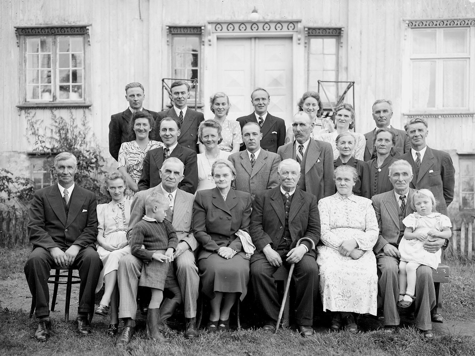 Tidlig femtitall. Norsk-amerikanerne er nr 3-4 fv første rekke. Ole Lervick (Lervik) og hans kone Marit Lervick (f. Torset N). Resten er Ole sin familie/slekt i Valsøyfjord, men jeg kjenner ikke navnene.
