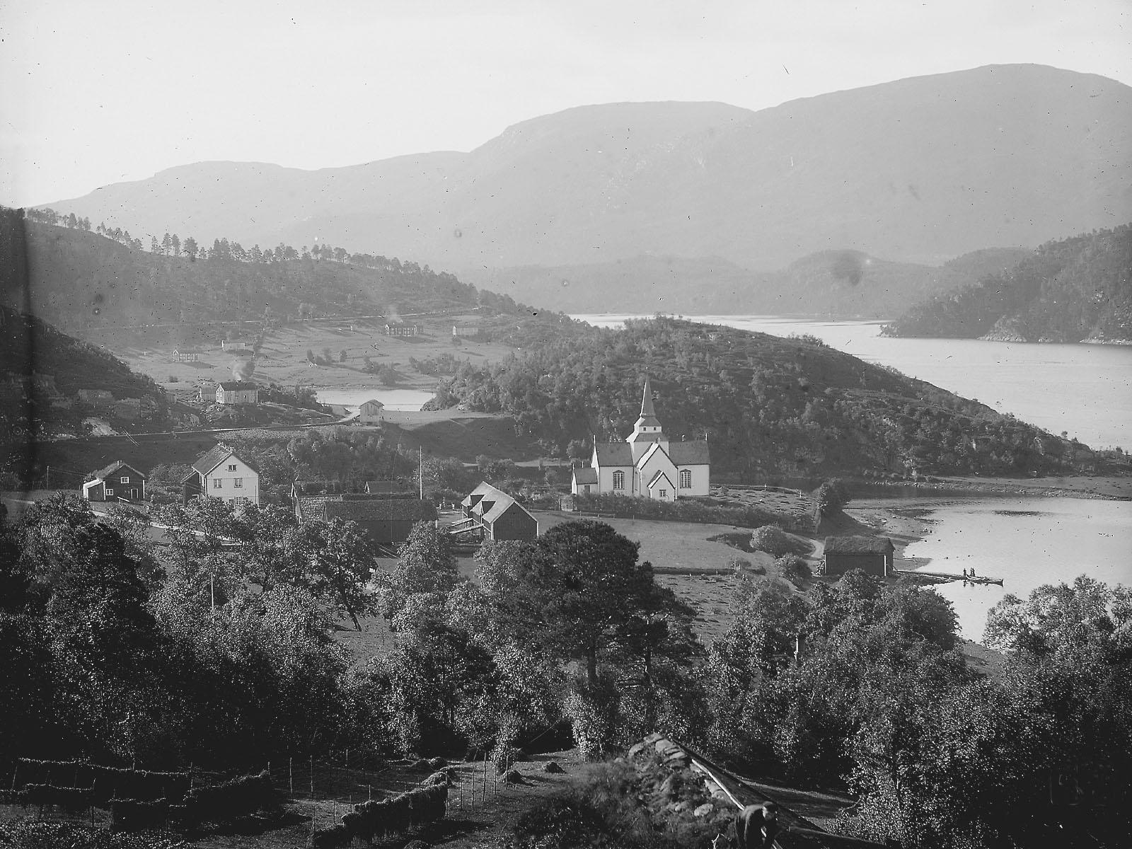 Bilde er tatt før 1923 med Aure gamle kirke og "gammelfjøset"
