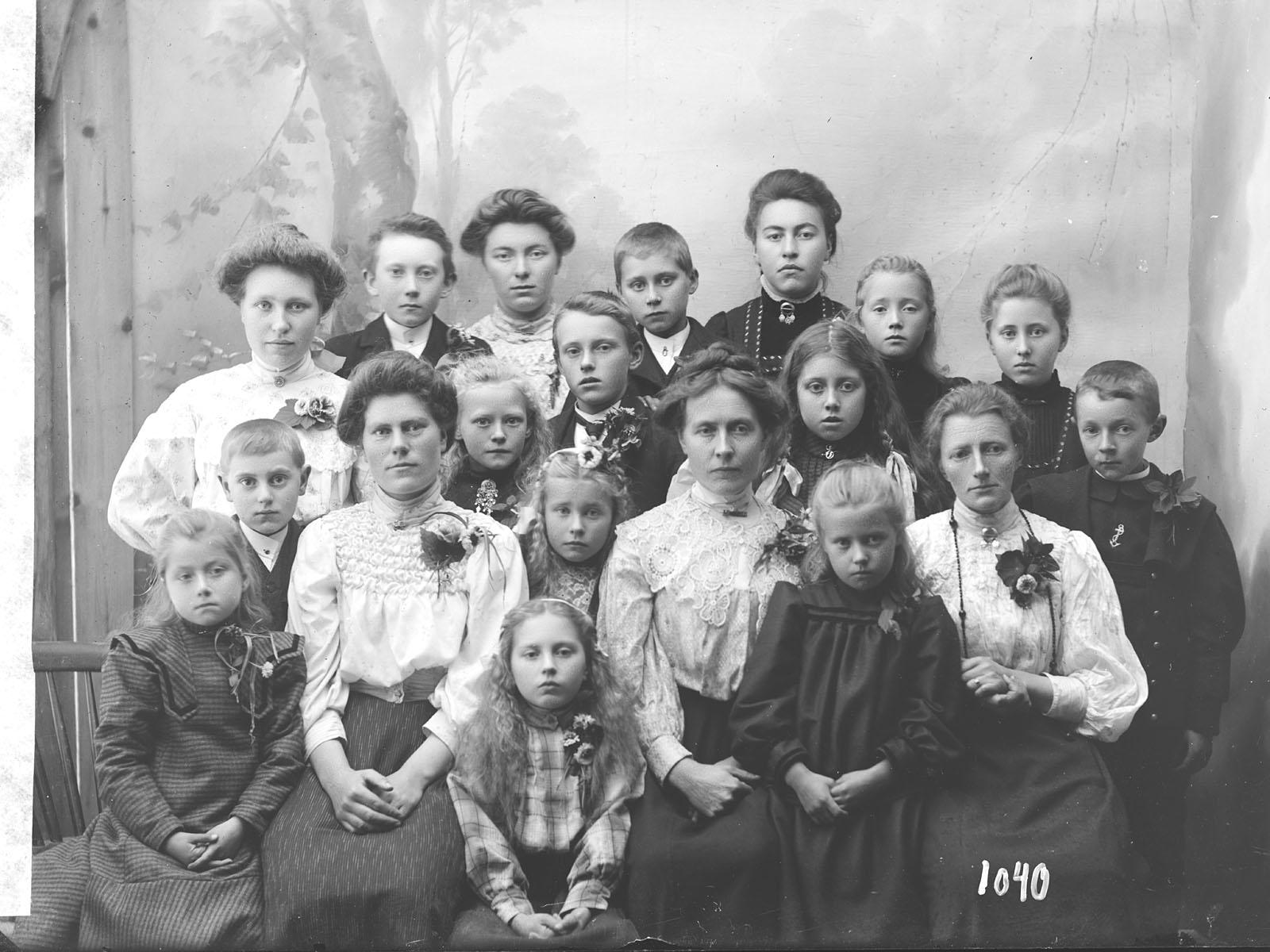 KIlde: Katrine Mæhle. -Her er familien Sandvik fra Eidestranda sterkt representert ser jeg. Nummer 4 foran fra venstre er Beret Johannesdatter Sandvik (1875-1958). Hun var datter av Johannes Paulsen Sandvik og Maren Olsdatter Skar. Beret var halvsøster av min tippoldemor Johanna Jensdatter Fjærli. Beret emigrerte til Amerika og levde i Minneapolis sammen med sin mann Knut Torbjørnsen Holm og deres adoptivdatter. Foran fra venstre, nummer 3 er min oldemor Margit Paulsdatter Sandvik (1898-1987). Hun var datter av lærer Paul Olsen Sandvik og Johanna Jensdatter Fjærli. Margit ble gift med Daniel Johnsen Skipnes og de tok over Sandvika etter Margits foreldre. Rett bak Margit står hennes lillesøster Birgit Paulsdatter Sandvik (1903-1994). Birgit ble gift med Olav Torset, også fra Aure. De emigrerte til Amerika og fikk to barn der. Rett bak Birgit står storebroren Ole Paulsen Sandvik (1897-1943). Ole var skipsfører og omkom under lasting av miner i Alger i 1943. Han har etterkommere. (Gutten til høyre kan være Anders Vaag.) Bildet (barneforening) sies å være fra 1908. Tidlig i Hans Ormset sitt virke som fotograf.