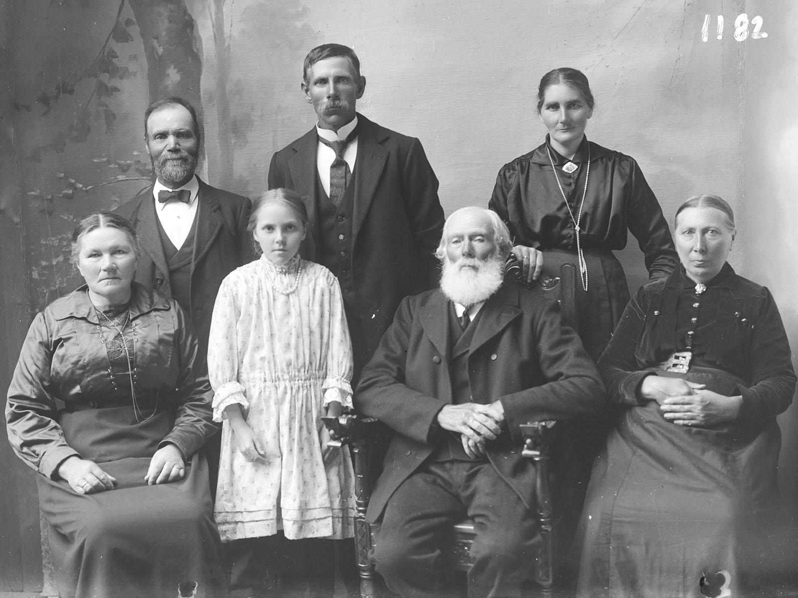 1. rekke fv.: Ukjent, Anne Marie Hansdatter Husfest (Ane Husfest), Peder Torstensen Husfest og Anne Marie Hansdatter Husfest (farfar og farmor til Ane).