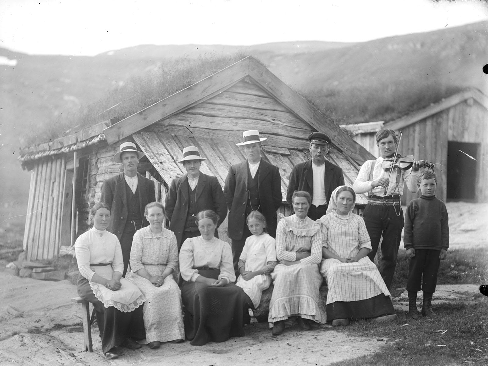 1. rfv: Ellen Vik (søster til Pål her), Johanna (setertaus i Medtgarden), Ingeborg Vik (søster til Pål), Margitt Lindås (mor til Lars Bratset - setertaus i Medtigarden), NN, Marit Vik (søster til Einar og P. Vik - Storgarden) og Olav Birger Vik (halvbror til Pål). 2. rfv: Knut Kalland (bestefar til Knut Torset i dag), Hans Ormset (fotografen), Haftor Kalland, Pål Rudolf Vik (bestefar til Pål R. Torset Vik) og spillemann P. Vik (bror til Marit og Einar Vik, Storgarden). Kilde: Kirsten P. Torset